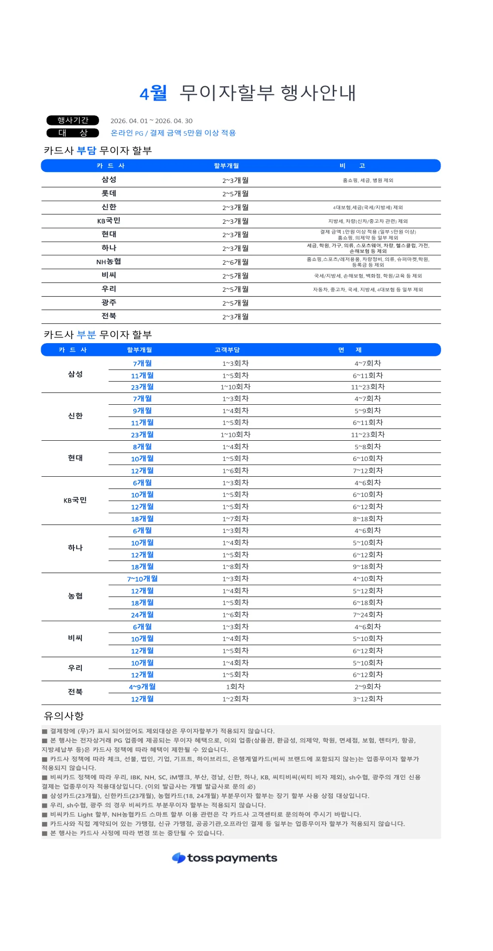 ◆ 2026년 4월 무이자 할부 이벤트 카드안내 ◆